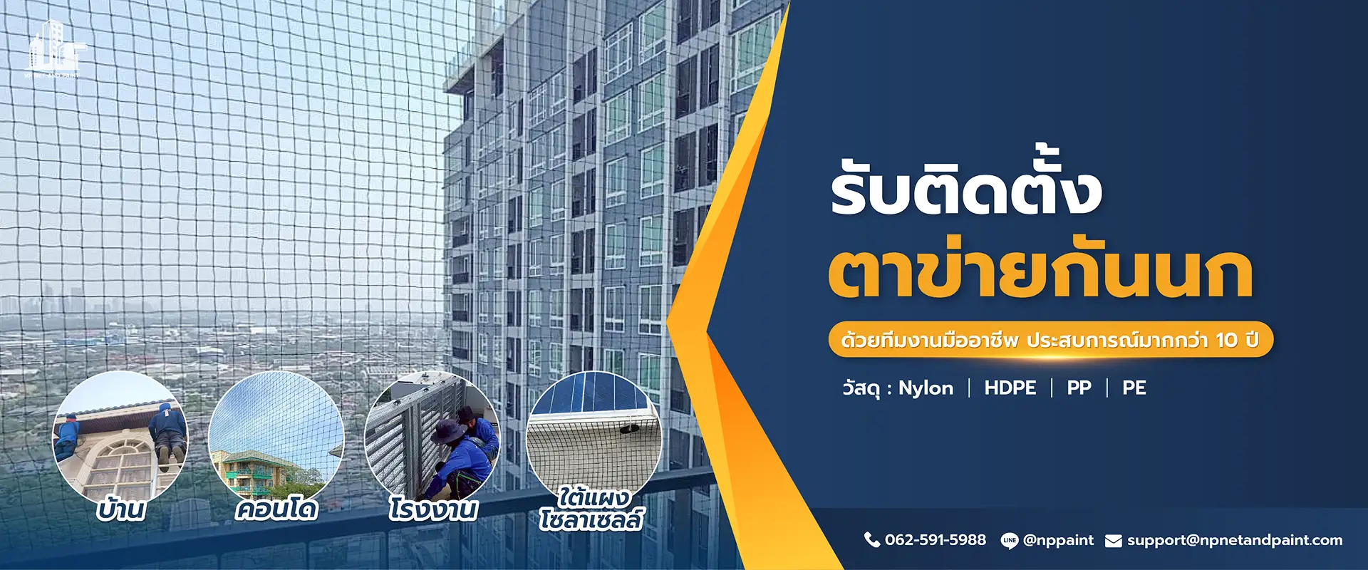 บริษัท เอ็นพี เน็ตแอนด์เพ้นท์ จำกัด ผู้เชี่ยวชาญ ติดตั้งตาข่ายกันนก โรยตัวทาสีอาคาร พ่นหลังคากันความร้อน ครอบคลุม กรุงเทพฯ ปริมณฑล และทั่วประเทศ